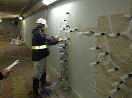コンクリートのひび割れ部分に注射器のような道具で接着剤を注入する作業です。