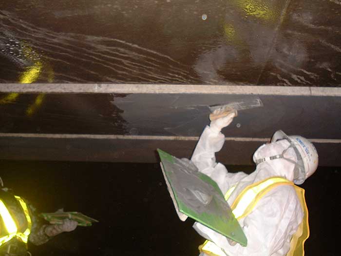 橋梁の強度を上げるために橋の裏側に炭素繊維を全体に塗る作業です。