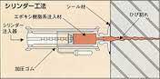 コンクリートのひび割れ部分に注射器のような道具で接着剤を注入する作業です。
